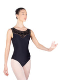The Ballet Rosa Corbeau leotard is a tank style with a low back. The top is mesh embossed with a flocked velvet motif, with a sweetheart neckline. Front fully lined.