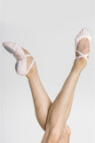 Split-sole stretch canvas ballet shoe. Full stretch canvas is handmade and machine stitched. No drawstring binding, which provides unsurpassed comfort and flexibility. This premium shoe also offers flat stitch pleats that prevent bunching and bulging under the toes and the sole of the foot. Lower vamp shows off the arch of the foot while the stretch canvas material will hug the dancer’s foot and provide a sleek and professional look.