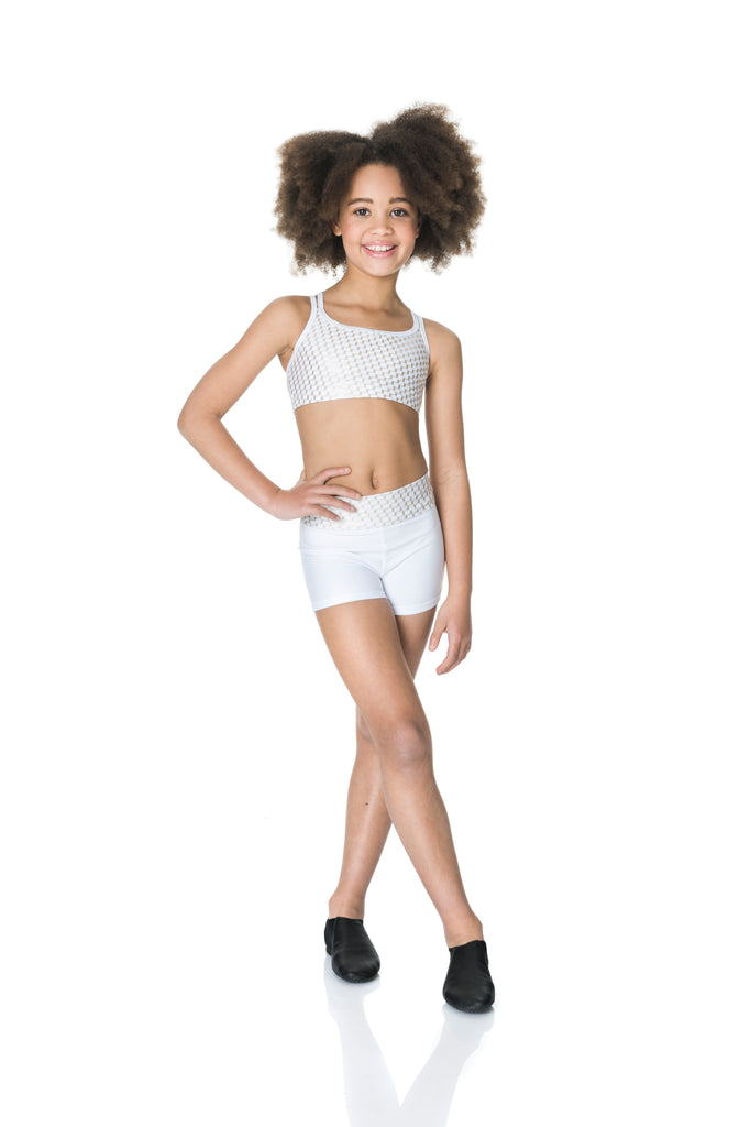 Studio7 classic strappy crop top and roll top short in an elegant white and gold checker print.