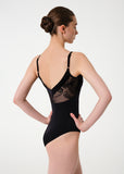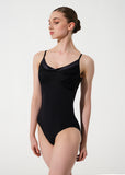 Clamisole leotard with velvet trim adjustable straps and princess seam detail. V- front neckline with mid-V-back fully front lined and pockets for bra cups.