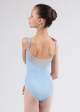 Mesh back leotardwith adjustable straps and adjustable pinch front.