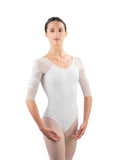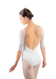 Aly leotard is classically romantic, featuring raglan half-sleeves of four-way stretch mesh delicately embroidered with exquisite roses.