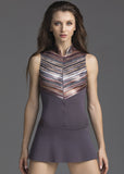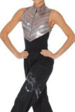 This high neck, open back leotard has a metallic finish sure to grab the gaze on stage. Ultra shimmery and ultra flattering. Elongated seam linesand a zip front.