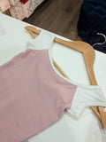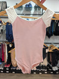 Soft rose pink on the main body, white sleeves and white trim for the perfect sweet and elegant leotard.