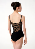 Flattering camisole leotard with flattering empire waist line . Unique flocked mesh overlay detail. Fully front lined and pockets for bra cups.