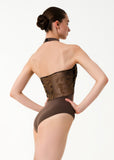 Halter leotard with clasp closure and small keyhole front opening. Mid V- back. Flocked mesh overlay with front lining and pockets for bra cups.