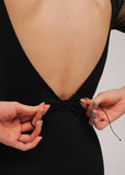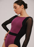 or our big finale, we have our long sleeve leotard for those who want a sleek finished appearance. The square neck line opposing the deep plunge adjustable pinch back are a study in contrasts. Stitching detail at the waist with black trim down the sides will give you the best lines ever!