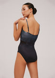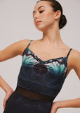 Stunning camisole leotard with adjustable straps features this one of a kind pattern! Adjustable pinch at the bust gives you control and a mesh insert encircles the waistline for a delicate touch.