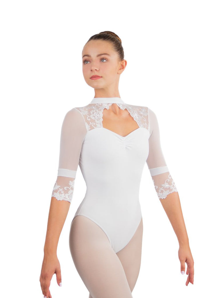 The Lucienne leotard features a high neck detailed in fine mesh, line forward with a sweetheart front keyhole and dramatic, low-cut ruched back.