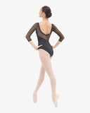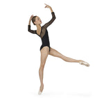 The ladies 3/4 sleeves leotard D0678 has a boat neckline in the front and a large 'V' neckline in the back to emphasize the dancer's body. The fine lace on the sleeves and in the back gives elegance to the silhouette