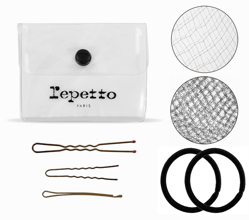 Black hair kit for dance buns containing two bun nets, 15 snow clips of 6.8 cm, 10 snow clips of 5 cm, 4 flat clips of 5 cm and 2 hair bands. Repetto Paris plastic pouch packaging with explanatory note inside.