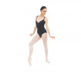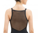 This wrap-around leotard has thin straps and a wrap-around cutout on the chest to enhance the dancer's upper body. The deep back mesh neckline emphasizes the back of the dancer and highlights the movements of the body.