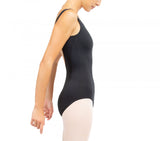 This high-necked leotard with back reveals the back of the dancer with a deep neckline that emphasizes curves and movements. Its U-shaped neckline on the front underscores the upper body and the fishnet finishes of the model subtly enhance the outfit.