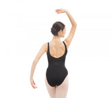This leotard with thin straps has a rounded neckline with gathers, in order to highlight the upper body of the dancer. The fancy back and the cutout under the bust enhance the classic look of this model.