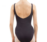 Leotard with thin straps. Round gathered neckline to highlight the top of the body. The fantasy detail in the back enhances its classic style. The cross-over chiffon frill gives a glimpse of the movements.
