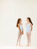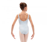 This thin straps leotard for little girls has a rounded neckline with gathering, to highlight the dancer's upper body. The fancy back and the cut under the bust enhance the classic appearance of this model.