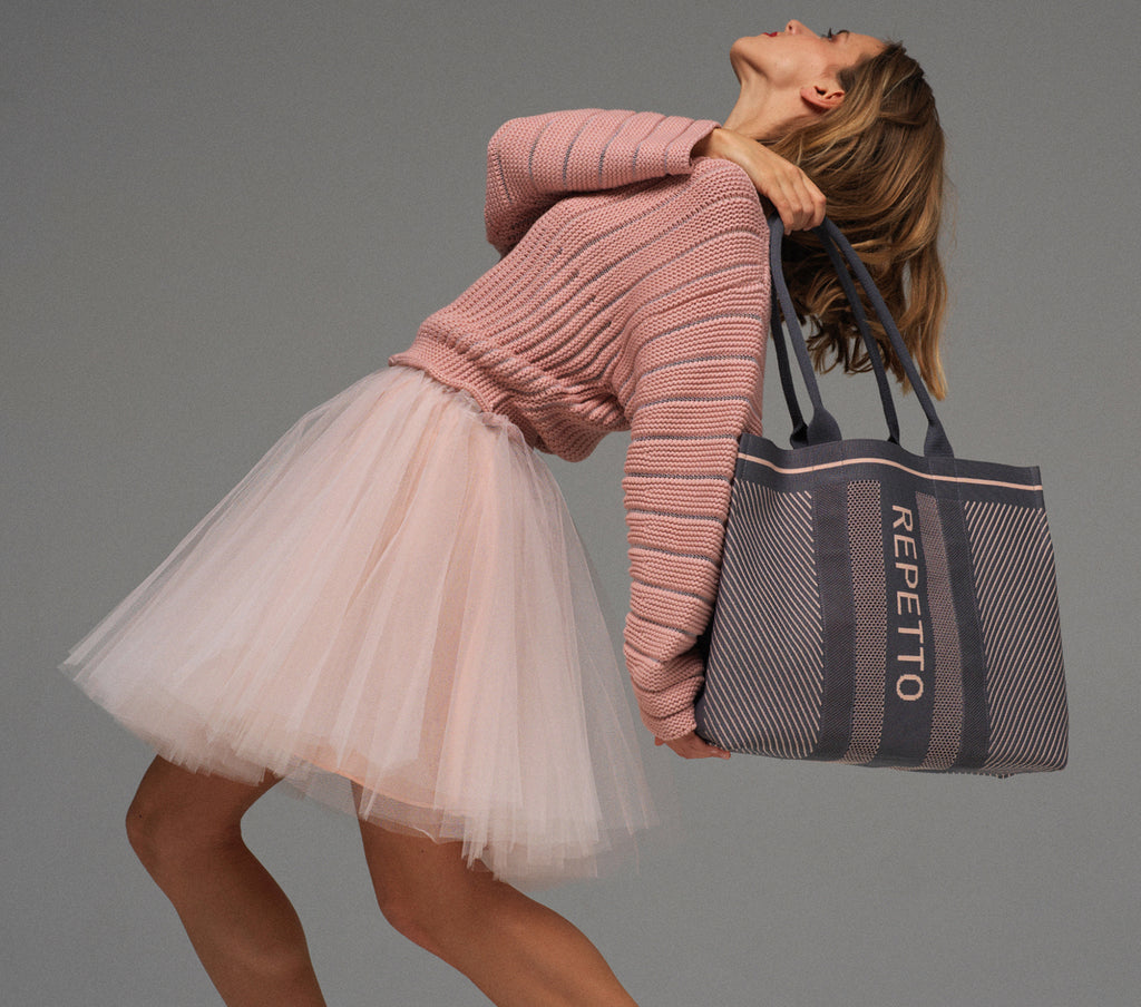 This uniquely designed tote is an iconic piece of the Bagagerie line. Born from the history of the knitted mesh demi-pointe, then of the sneaker, this knitting technique is now available in bags. The yarns in the collection's identity colors are knitted to create a single panel, with graphic and modern patterns.