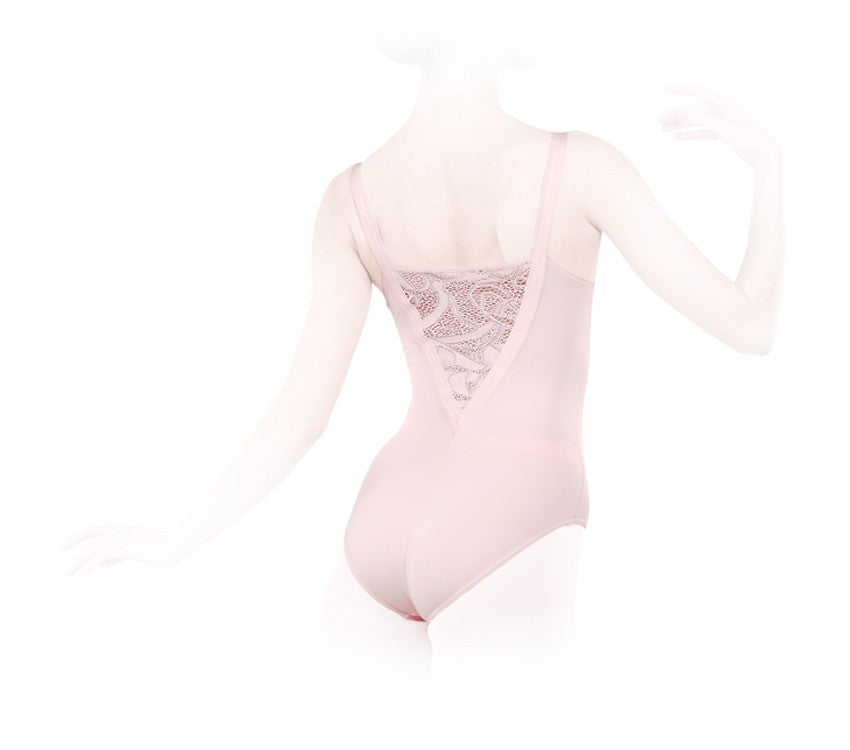 The women leotard D0656 with elasticated straps, offers a very good support to the leotard, and helps it to suit perfectly to the dancer. The deep back neckline, made with a ribbon pattern lace, lets appear the dancer’s back. The elastane polyamide fabric gives a mat aspect to the leotard, and well-shaped the dancer's silhouette.