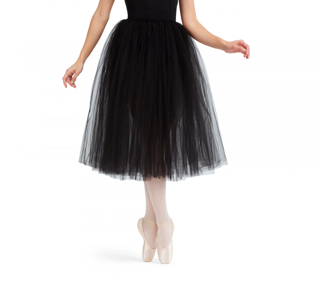Mid-long skirt for ladies, 'Degas' shape, composed of 3 superimposed thicknesses of thin and soft tulle. It gives a glimpse of the movements and perfectly follows the gestures of the dancer. It can be worn during rehearsals, as well as on stage and can be used as basis for shows costumes. Elastic waistband. Three thicknesses of tulle.