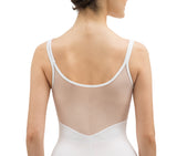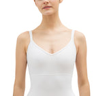 his leotard for women with double straps, has a V neckline at the front and a large back neckline. The front topstitching highlights the silhouette of the dancer. The lace at the chest and at the back brings fantasy to the product, while enhancing its elegant character.