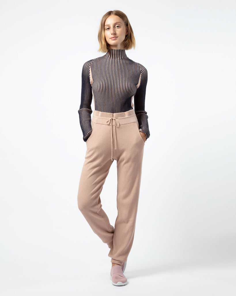 Made from a soft and fluid knit, these knit pants tightened at the waist by a tie, provide extreme comfort and adapt with great ease to all everyday movements.
