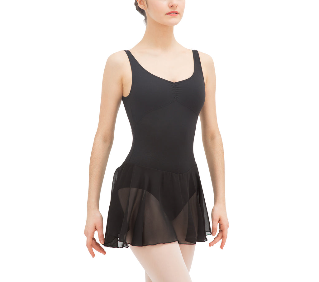This fine-straps tunic has a rounded neckline with gathers, to highlight the dancer's upper body. The fancy back and the underbust cut enhance the classic look of this model. The chiffon skirt lets you guess the movements.