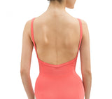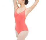 Woman leotard with spaghetti straps, with a wide neck trim for a good maintain. The gathered neckline is adjustable with a small inner ribbon in satin. Front and back V-neckline. The princess seams emphasize the curves of the dancer. This style is lined in the front. Available in adult size and in many colours, this is an ideal product for major schools and conservatory dancing classes. Transparent transfer of the Repetto logo on the back. Mat aspect.