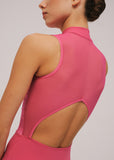 This band collar leotard will give you the illusion of extra long lines - between the high neck, the invisible zipper on the front and the low waist line, you can’t go wrong here! Sheer mesh overlay on the front floral print exudes class. The back features a strong mesh upper and a soft triangle shaped keyhole.