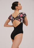 Here we have a lovely cap sleeve leotard with a sheer mesh bust overlay on top of our fresh floral print. Low V shaped back below the diamond keyhole will show off every curve.