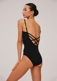 The deep plunging bust on this delightful adjustable strap camisole leotard is accentuated with our strong mesh above and below the stitching detail. Interwoven double criss cross straps on the back can’t be missed!