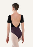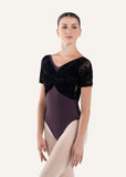 Dive into the indulgence of SEBILLE, a delectable V-neck short-sleeve leotard. An independent shirred overlay envelopes the bust, lavishly adorned with our signature flocking. The back mirrors this elegance, with flocking tracing down to a deep waistline on a dramatic back drop, enhanced by an adjustable pinch.