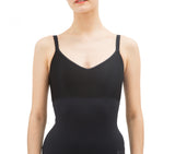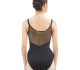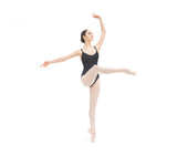 his leotard for women with double straps, has a V neckline at the front and a large back neckline. The front topstitching highlights the silhouette of the dancer. The lace at the chest and at the back brings fantasy to the product, while enhancing its elegant character.