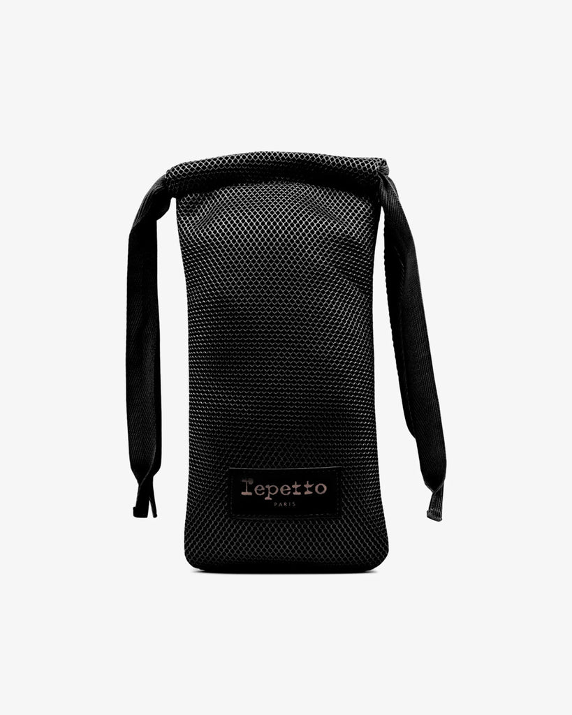 This pouch is ideal for carrying ballet shoes. The mesh material offers breathability to the model. The grosgrain tightening ribbons are subtle and delicate reminiscent of ballet codes. This model will accompany perfectly the duffel models of the same material.