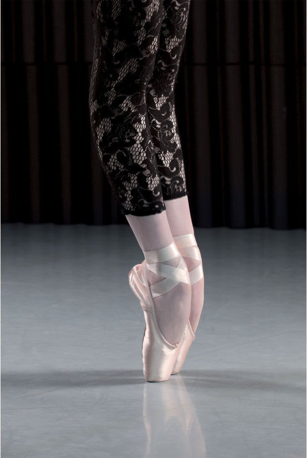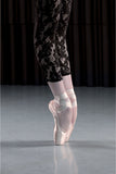 The Roman foot is an ideal foot shape for pointe work, as the first three toes are of equal length and have the most contact with the internal platform of the pointe shoe. Additionally, the external platform of the La Pointe – Square offers the broadest platform of all Wear Moi pointe shoes. A broad platform provides the greatest feeling of security while en pointe. The cut of a U shape throat mimics the lines of the square box and is often the choice of dancers worldwide. It contains a cotton drawstring encased in a cotton binding. The construction of La Pointe - Square is in the turned method and offers pleats on the bottom front of the shoe and contains a standard crown height with traditional side and heel measurements. A reinforced platform extends the longevity of this pointe shoe. An embossed leather outsole marked with a decorative design, including the size, width, and shank strength, provides traction