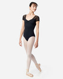 Short sleeve Leotard Valeria, This stunning dance leotard features mesh short sleeves and a pinched front neckline. The front shoulders and the mid-low V back are complemented by delicate lace trim detailing for an elegant look. Leotard is fully front lined with a built-in shelf bra for extra support.