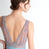 Era has the characteristic “retrò fashion” charm in allusion to the classical ballet opera “Diana and Acteon” and to the world of Greek mythology. The upper part’s soft fit gives elegance to the dance movements since the tulle fabric looks like floating in the air. The “imperial cut” is finished with a belt characterized by a graceful daisies’ embroidery pattern which exalts the tulle pleats of the top part. The same soft and vaporous effect is on the back side defined by a V shape neckline.