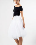 Details : "Midday" length. Two overlapping tulle flounces. Elastic at the waist. Interior lining. Metallic circle with the R logo.