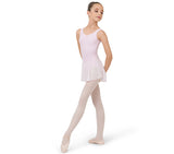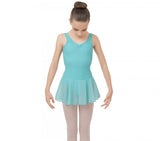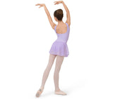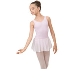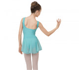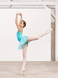 Girl’s leotard, tank shape. Specifically developed for the first years of dance practice. The body maintain is perfectly respected thanks to the large straps. The gathered neckline adjustable with a small internal satin ribbon brings a fancy touch to the leotard. The chiffon skirt gives a glimpse of the movements. This style is lined in the front.
