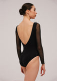 or our big finale, we have our long sleeve leotard for those who want a sleek finished appearance. The square neck line opposing the deep plunge adjustable pinch back are a study in contrasts. Stitching detail at the waist with black trim down the sides will give you the best lines ever!